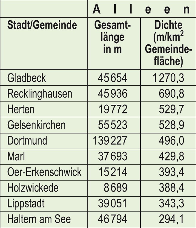 Die meisten Alleen pro Quadratkilometer Gemeindefläche weisen in Westfalen seit den 1960er Jahren einige Ruhrgebietsstädte auf (Abb. 1 u. Tab. 1). Hier konnte man sich eine Aufwertung von Straßen als Alleen wirtschaftlich leisten und schätzte zudem die Bäume wegen ihrer Filterwirkung in Bezug auf die Luft. Oft wählte man dabei Platanen, weil sie als besonders widerstandsfähig gegen Rauch, Ruß und Luftschadstoffe galten.
