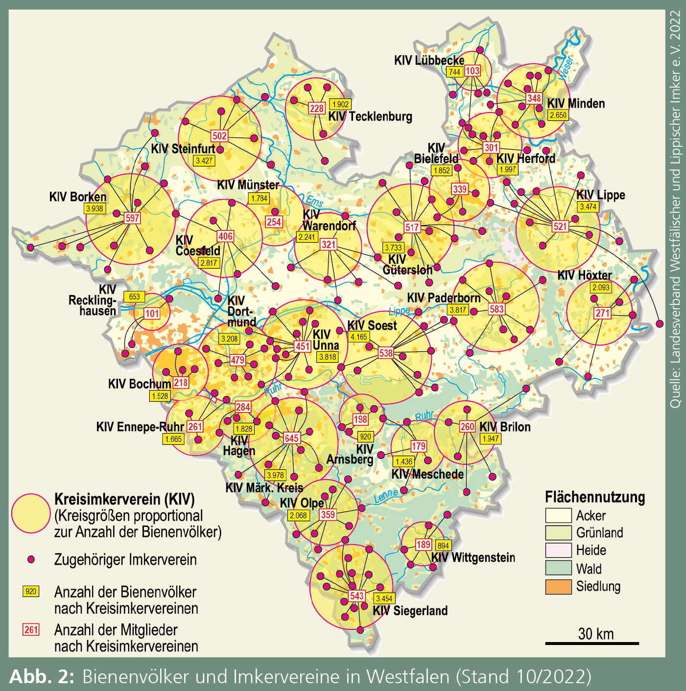Die Schwerpunkte der Bienenhaltung in Ostwestfalen liegen in den KIV Paderborn (ca. 3.800 Völker), Gütersloh (3.700) und Lippe (3.500). Aber auch nördlich hiervon ist – wenn auch in geringerem Maße – eine erfolgreiche Imkerei möglich (Abb. 2).