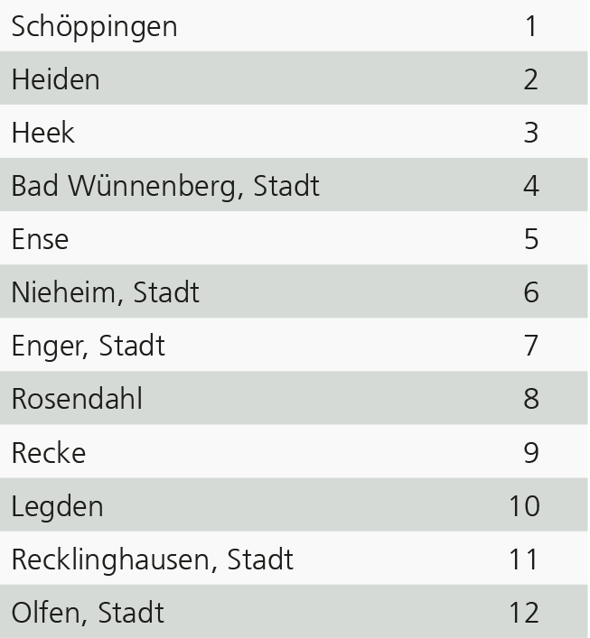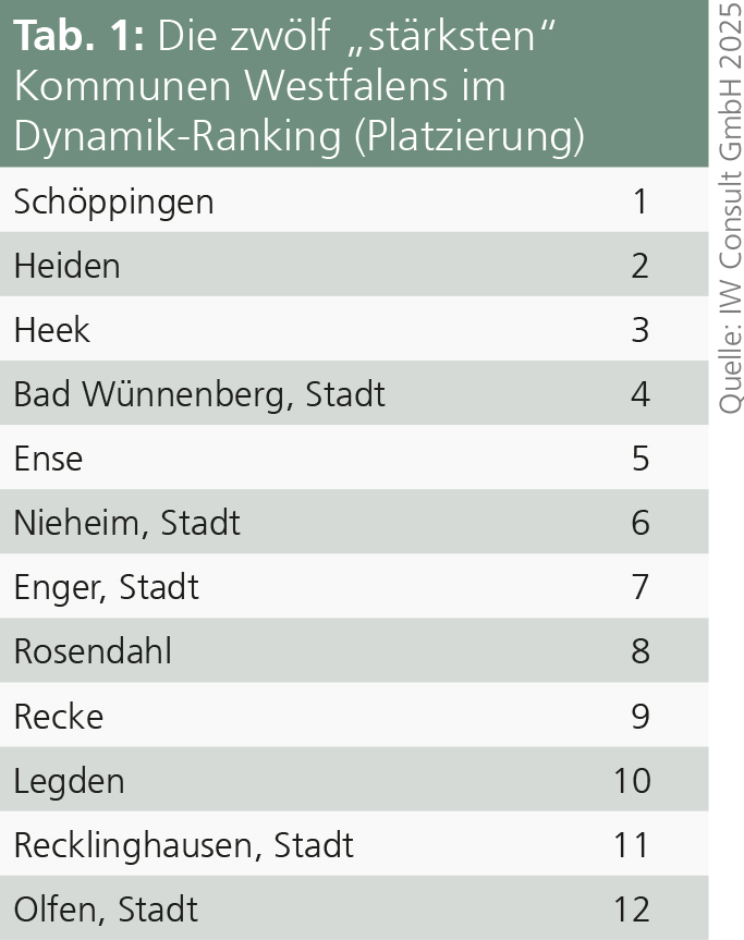 Im Auftrag der Landesvereinigung der Unternehmensverbände NRW hat das Institut der deutschen Wirtschaft Köln Consult GmbH Mitte 2025 das "Kommunalranking NRW" veröffentlicht. Aus dieser Studie wurden für den folgenden Beitrag die 231 Städte und Gemeinden Westfalens isoliert und in ein eigenes Ranking umgerechnet, das die Entwicklung der Kommunen in den vergangenen fünf Jahren widerspiegelt. Bei diesem "Dynamik-Ranking" stieg beispielhaft die Stadt Recklinghausen von Platz 19 im NRW-weiten Vergleich auf Platz 11 innerhalb Westfalens. Schöppingen und Heiden (beide Kr. Borken) nahmen andererseits schon NRW-weit die vorderen beiden Plätze ein – und stehen damit natürlich auch in Westfalen auf Platz 1 und 2 (Tab. 1).