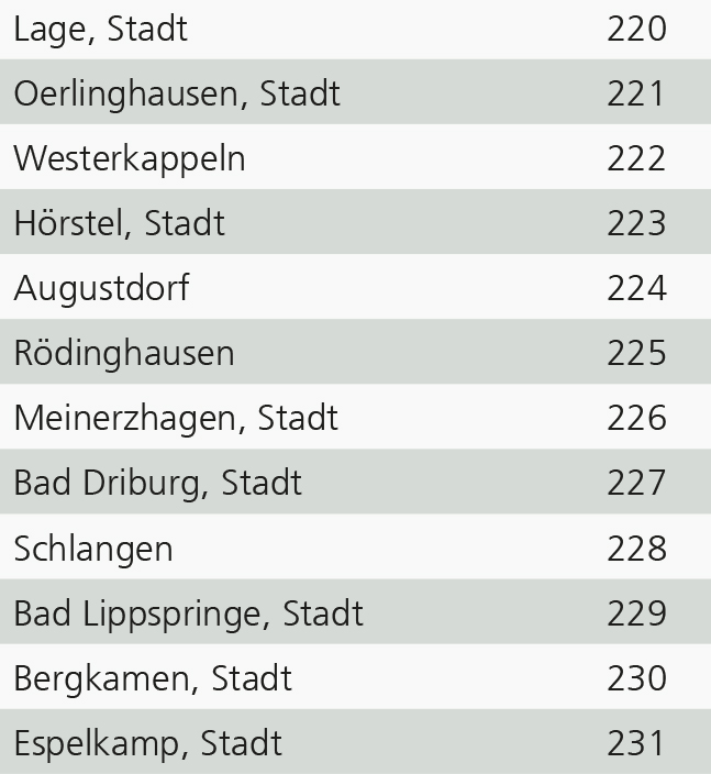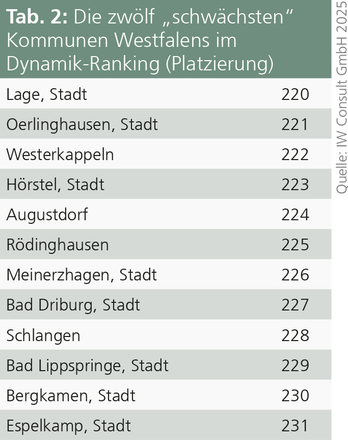 Zu den Schlusslichtern gehören – bis auf wenige Ausnahmen – Kommunen aus dem östlichen Westfalen, darunter zahlreiche aus dem Kreis Lippe (Tab. 2). Bad Lippspringe (Kr. Paderborn) beispielsweise erreicht westfalenweit lediglich den drittletzten Platz (229), die benachbarten Kommunen Schlangen und Augustdorf (beide Kr. Lippe) die Ränge 228 bzw. 224 (Tab. 2). Bad Lippspringe fällt besonders auf durch negative Ergebnisse bei den Indikatoren Baugenehmigungen, Wohnfläche je Einwohner, Altersquotient und Kaufkraft. Die Stadt Verl (Kr. Gütersloh) – beim Niveau-Ranking westfalenweit sogar auf dem zweiten Rang – gehört beim Dynamik-Ranking jedoch zu den "schwächsten" Kommunen des Landesteils (Platz 201). Insbesondere hohe Gewerbesteuerhebesätze und die geringe kommunale Finanzausstattung tragen zu diesem negativen Ergebnis bei.