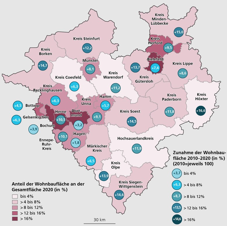 Die Gesamtfläche für Industrie und Gewerbe erhöhte sich in Westfalen zwischen 2010 und 2020 um 16,5%, im Rheinland betrug die entsprechende Steigerung 12,6%.