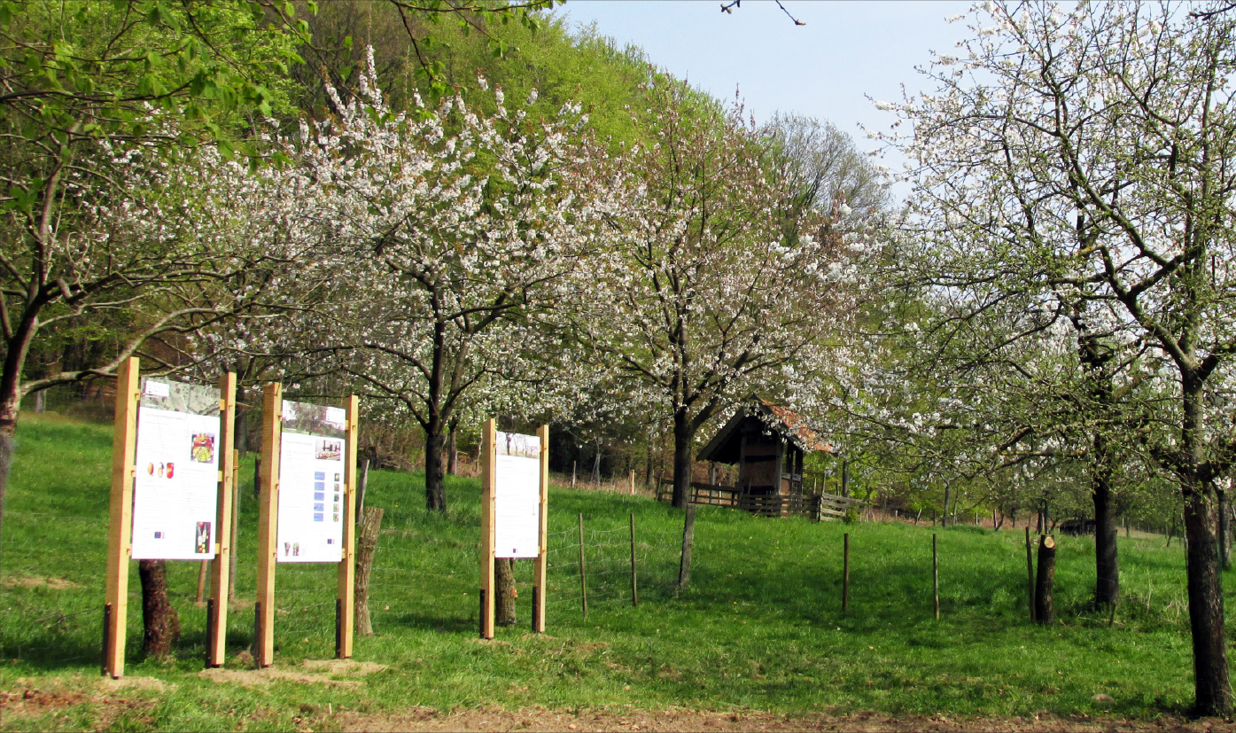 Im Rahmen des LEADER-Projekts "Obstarche" wurden im April 2015 an der Obstwiese verschiedene Infotafeln zu den Themen "Obstsortenmuseum Fliehburg", "Pomologie", "Obstbaumschnitt", und "Lebensraum Obstwiese" aufgestellt (Abb. 2). Zudem wurde ein sog. Nützlingsturm errichtet (Abb. 3), der beispielhaft einen Wohn- und Lebensraum für viele Insekten, Spinnen, aber auch Säugetiere, Amphibien und Reptilien bereitstellt. Viele dieser Tierarten sind Nützlinge, d.h. sie sind die natürlichen Feinde von Obstbaumschädlingen.