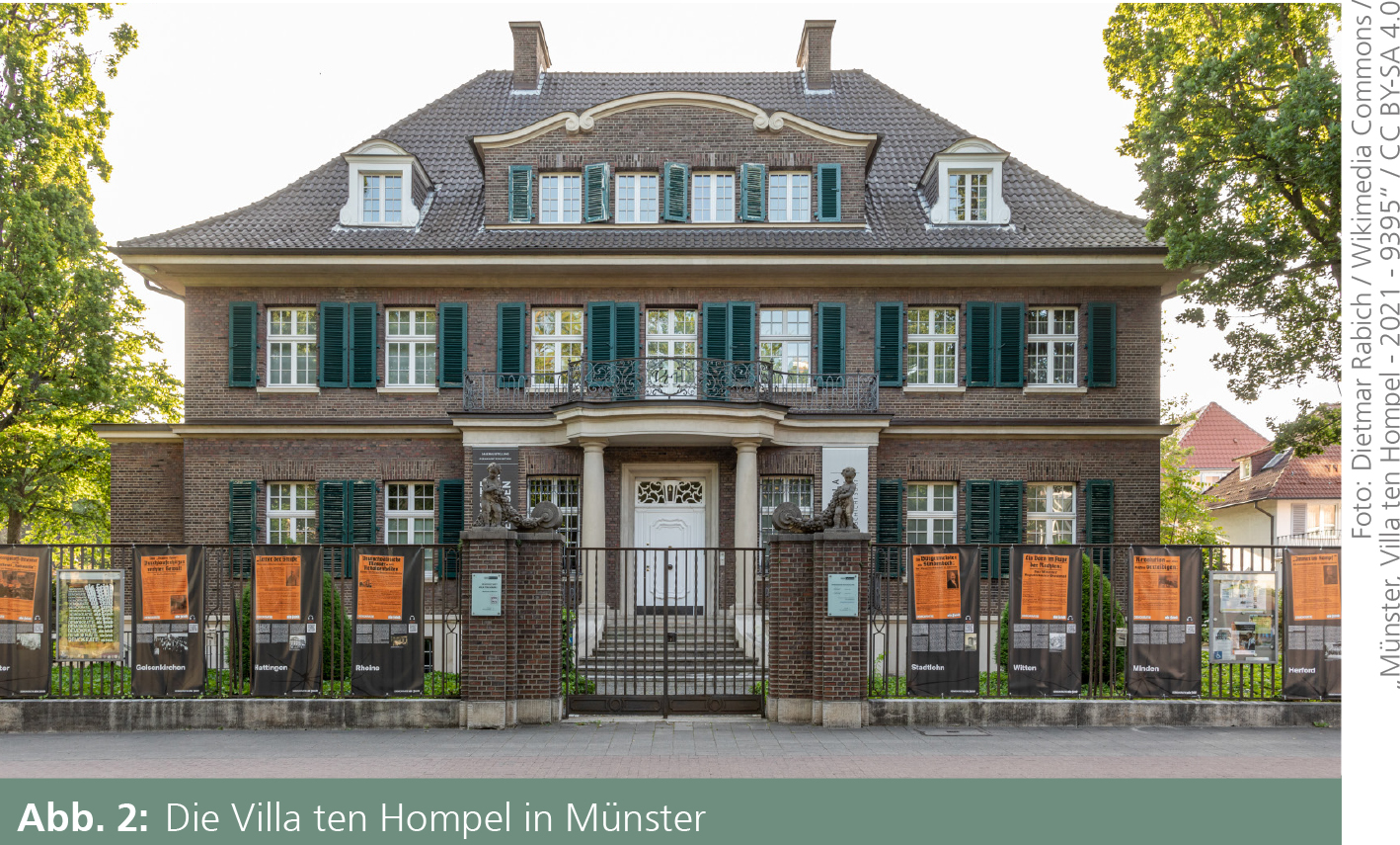 Die Villa ten Hompel in Münster (Abb. 2), eine frühere Fabrikantenvilla, wurde Ende 1999 zum "Geschichtsort" zur Erforschung und Dokumentation vor allem jener Taten, die von nationalsozialistischen "Schreibtischtätern", von der Polizei und von Behörden geplant und durchgeführt wurden. Das Haus war ab 1940 ein Hauptquartier der Ordnungspolizei, die u.a. für die Bewachung von Deportationen, Arbeitserziehungslagern und "Fremdarbeitern" mit zuständig war. Dem Befehlshaber, der hier bis 1944 seinen Dienstsitz hatte, unterstanden fast 200.000 Mann. Der "Geschichtsort" arbeitet eng zusammen mit den Hochschulen Münsters, mit der Gesellschaft für Christlich-Jüdische Zusammenarbeit, der Bezirksregierung Münster, der Bundeszentrale für politische Bildung, mit Ausbildungsstellen der Polizei, der Bundeswehr, der Justiz etc. Die Besucherzahlen – inklusive vieler Schulklassen – liegen bei deutlich über 30.000 pro Jahr. Die Villa ten Hompel ist heute außerdem Dienstsitz des Arbeitskreises der NS-Gedenkstätten und -Erinnerungsorte (stadt-muenster.de/villa-ten-hompel).