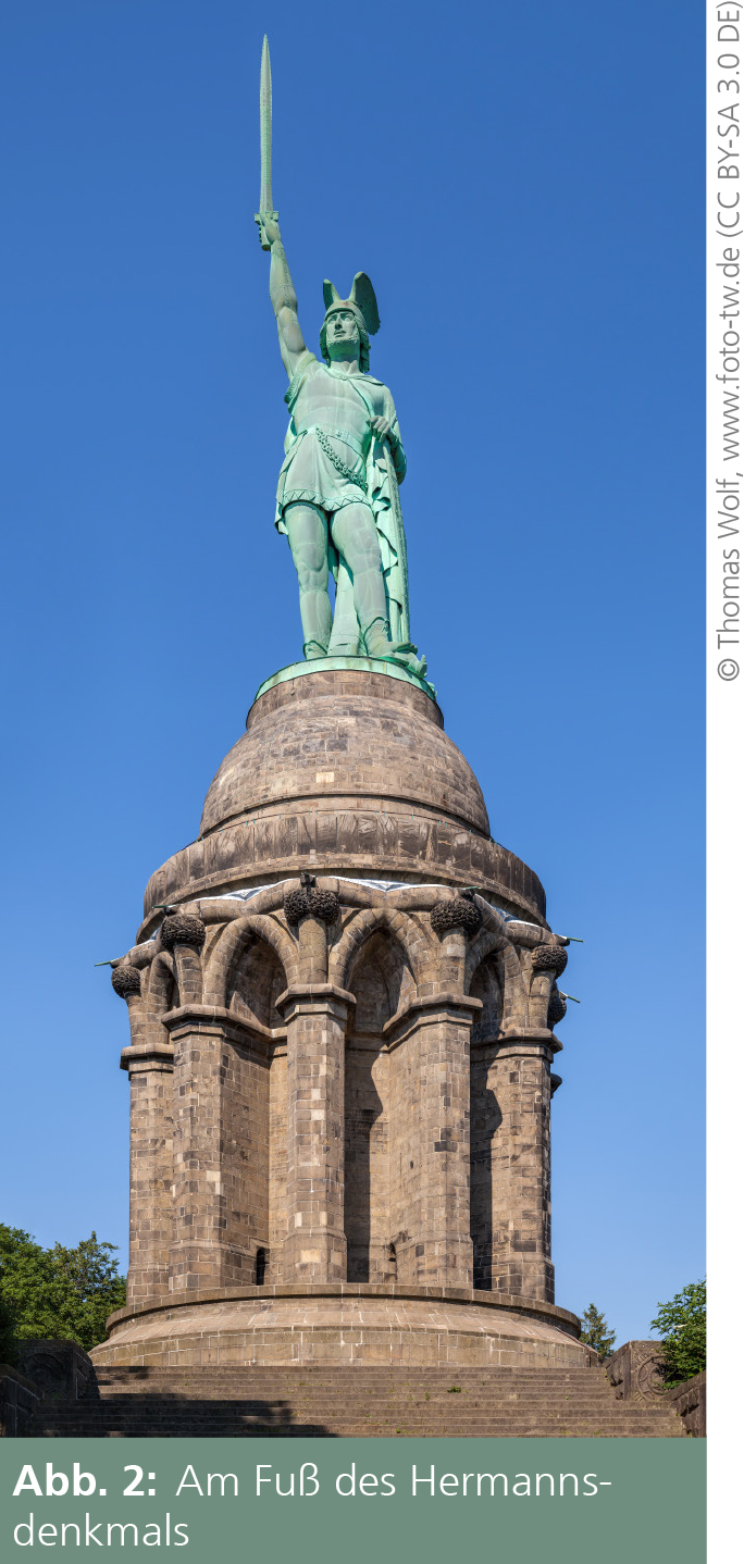 Seit dem Jahr 1875 thront die Hermannsstatue auf dem knapp 400 Meter hohen Berg Grotenburg im lippischen Detmold – mit Blick und Schwert nach Westen gerichtet (Abb. 1). Dort befand sich zum einen der damalige "Erzfeind" Frankreich. Außerdem kam aus dieser Richtung bereits im Jahr 9 nach Christus der römische Feldherr Varus mit seinen Legionen über den Rhein, um "Germanien" zu erobern – doch dieses Vorhaben misslang: Die eigentlich überlegenen römischen Truppen wurden von germanischen Stämmen unter ihrem Anführer Arminius – quasi mit vereinten Kräften – vernichtend geschlagen. Die legendäre "Varusschlacht" im Teutoburger Wald (s. Beitrag Brepohl) war Grundlage für die Errichtung des Hermannsdenkmals, mit dessen Bau bereits im Jahr 1838 unter Leitung des Architekten Ernst von Bandel begonnen wurde.