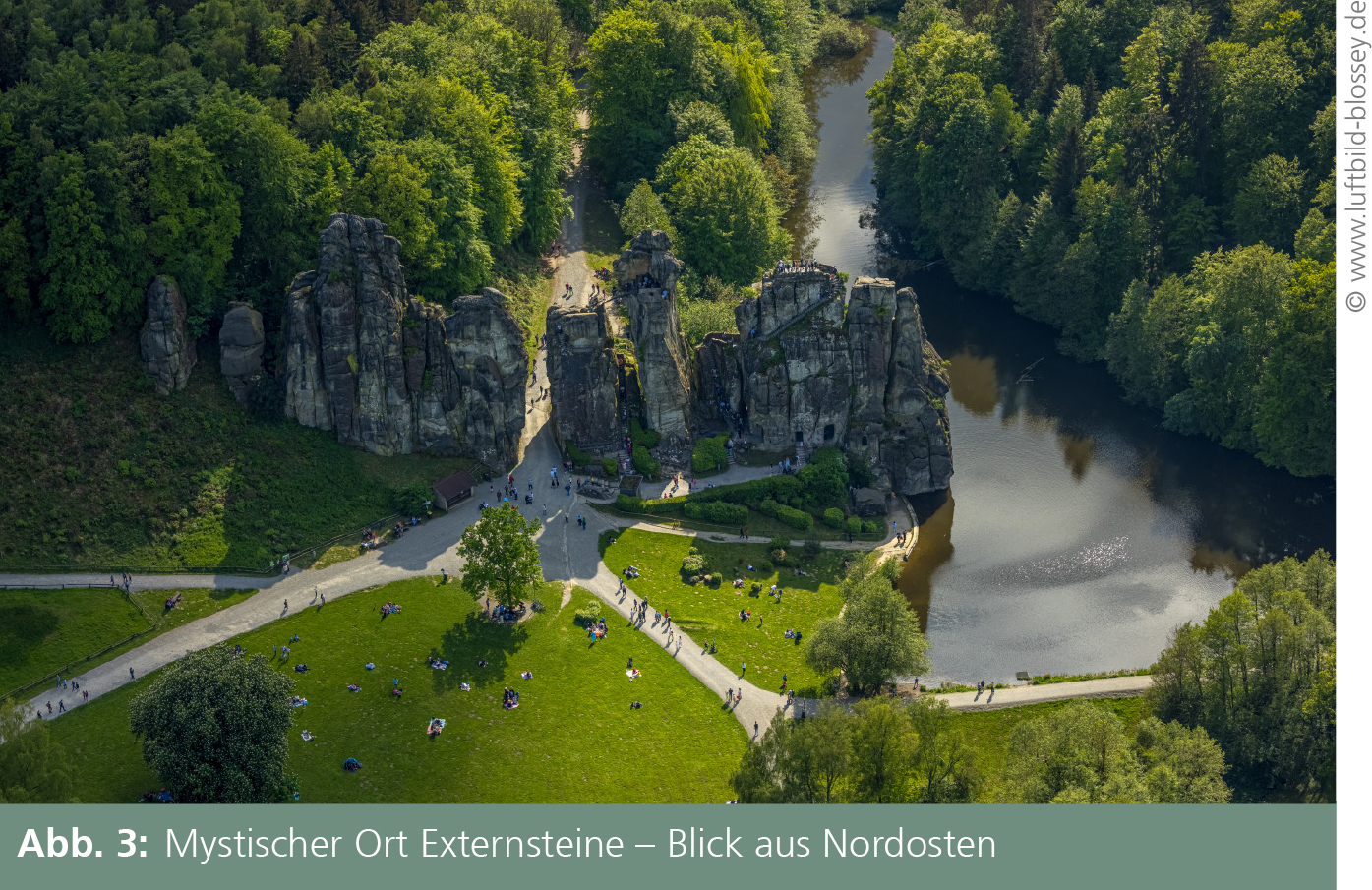 Unweit des Hermannsdenkmals befindet sich in südöstlicher Richtung auf dem Stadtgebiet von Horn-Bad Meinberg mit der Sandsteinformation der Externsteine eine weitere national bedeutende wie einmalige Sehenswürdigkeit. Eigentümer ist auch hier der Landesverband Lippe. Das aus insgesamt 13 grauen, zerklüfteten Felsen bestehende linienförmige Ensemble ragt dabei bis über 40 m aus der ansonsten weitgehend aus Wald und Wasser bestehenden Umgebung senkrecht in die Höhe – ein Anblick, der die Menschen von jeher fasziniert hat (Abb. 3).