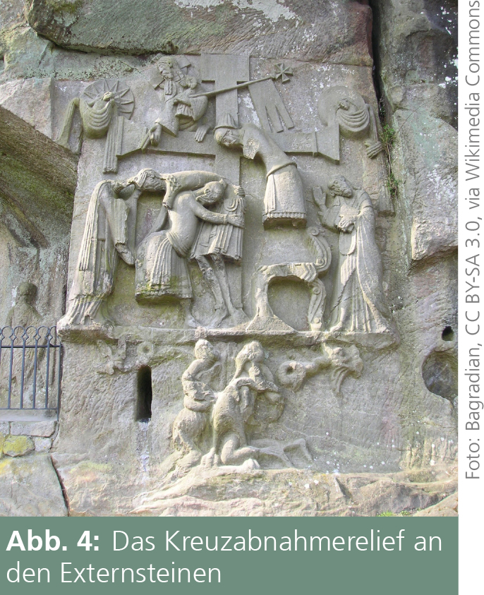 Die ältesten Beweise für menschliche Aktivitäten an der Felsgruppe sind etwa 10.000 Jahre alt. Funde von Spitzen und Klingen aus Feuerstein deuten darauf hin, dass Jäger damals hier Schutz gesucht haben könnten. Die anthropogenen Zeugnisse, welche die Externsteine zu einem auch in kulturgeschichtlicher Hinsicht herausragenden Ort werden ließen, stammen vermutlich aus dem Mittelalter. Hierbei ist vor allem das monumentale Kreuzabnahmerelief zu nennen, das Steinmetze wahrscheinlich im 12. Jh. in den Felsen meißelten (Abb. 4). Es zeigt die Abnahme des Leichnams Jesu Christi vom Kreuz und "[…] ist in seiner Art einmalig und ein Kunstwerk von europäischem Rang" (ebd. o.J. c). Daneben geben u.a. künstlich geschaffene Grotten, ein Felsengrab sowie eine Höhenkammer der Wissenschaft hinsichtlich Alter und Funktion bis heute Rätsel auf. Eine verbreitete These lautet, dass es sich bei diesen Anlagen "[…] um die im Hochmittelalter nachgebildeten heiligen Stätten Jerusalems […] handelt" (ebd. o.J. d). Durch das Fehlen eindeutiger Beweise waren und sind die Externsteine für viele aber weiterhin ein sagenumwobener und mystischer Ort, der bisweilen sogar mit dem englischen Stonehenge verglichen wird (Deutschlandfunk Kultur 2015).