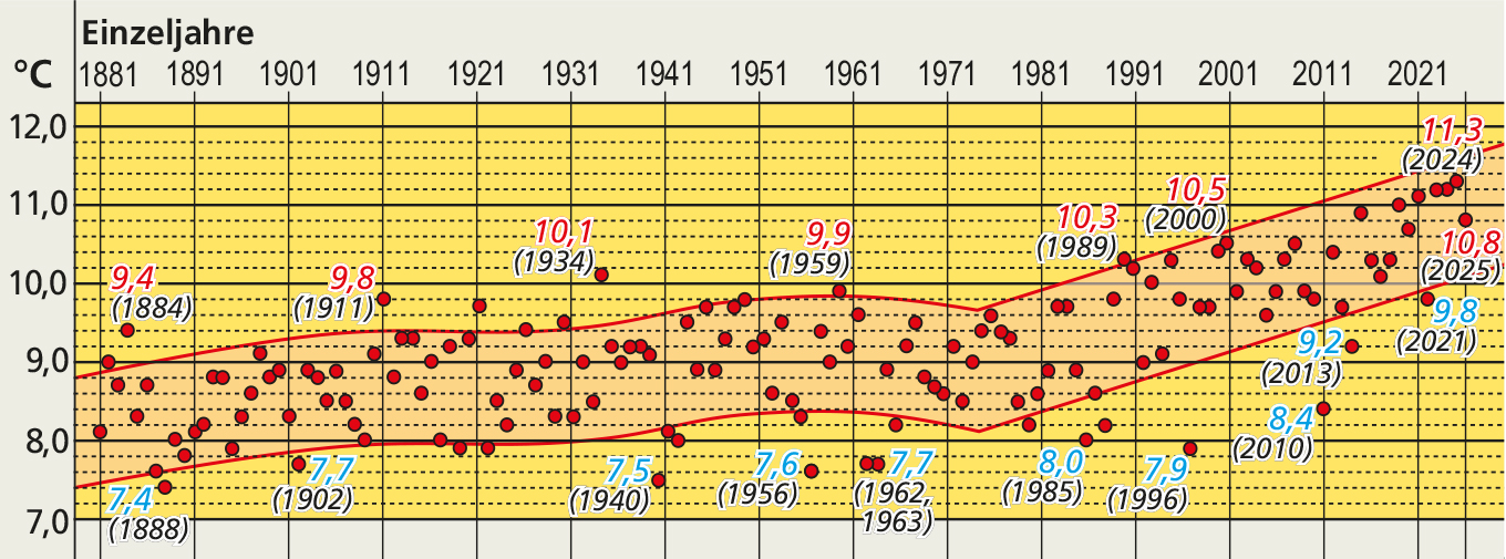 Bei der Betrachtung der NRW-Jahrestemperaturen seit 1881 bewegten sich die Werte bis Mitte der 1980er Jahre in einem horizontal verlaufenden Korridor von 7,4 bis unter 10 °C (Abb. 2). Als besonders warm übertraf darin nur das Jahr 1934 den Wert von 10 °C. Ab 1989 häuften sich in einem ansteigenden Korridor die Jahre mit Durchschnittstemperaturen von mehr als 10 °C. Nach dem Jahr 2021 wurde die 10 °C-Grenze nicht mehr unterschritten. Das Jahr 2024 übertraf dabei die Jahre 2022 und 2023 sogar noch um 0,1 °C.