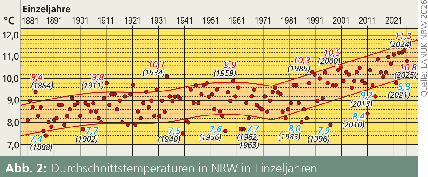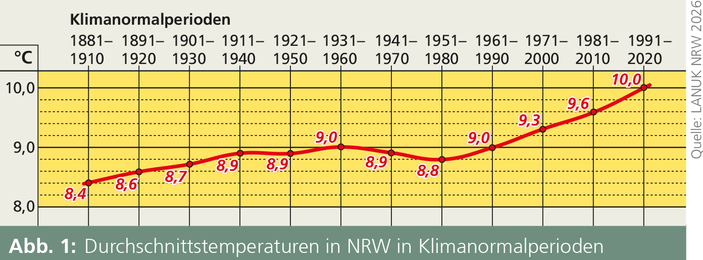Das Klima wird im Vergleich zum Wetter und zur Witterung über einen Zeitraum von 30 Jahren, der sog. Klimanormalperiode, charakterisiert (LANUK NRW 2026). Hierbei wird die Durchschnittstemperatur anhand der Jahresmittelwerte des entsprechenden Zeitraums berechnet. Bedingt durch den Beginn der aufgezeichneten Messungen im Jahr 1881 bezieht sich der Mittelwert der ältesten zur Verfügung stehenden Klimanormalperiode auf den Zeitraum von 1881 bis 1910. Mit 8,4 °C wurde in dieser Zeit der für NRW niedrigste Mittelwert überhaupt ermittelt. Nach einem Anstieg bis auf 9,0 °C (1931–1960) folgten zwei Perioden mit geringfügig niedrigeren Temperaturen, bevor ein kontinuierlicher Temperaturanstieg bis auf 10,0 °C einsetzte (Abb. 1).