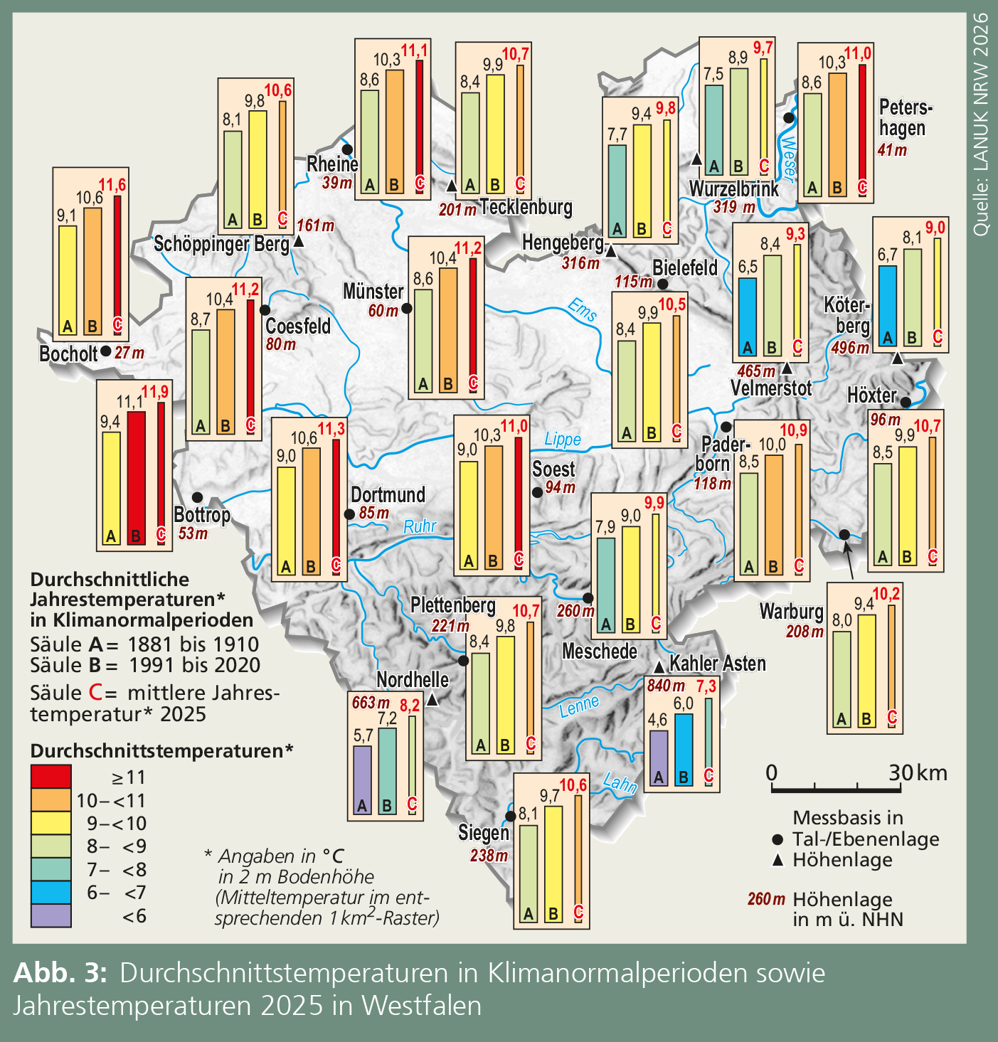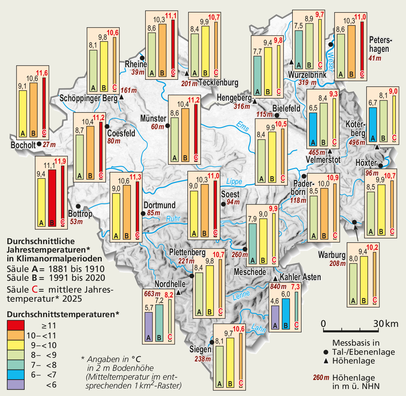 Nach dem bisher wärmsten Jahr 2024 folgte 2025 ein vergleichsweise kühles Jahr mit einer Durchschnittstemperatur von 10,8 °C (Abb. 2). Die durchschnittlichen Jahrestemperaturen lagen 2025 an den ausgewählten Orten Westfalens (Abb. 3) zwischen 7,3 °C auf dem Kahlen Asten und 11,9 °C in Bottrop. Wärmste Region war der westliche Rand Westfalens. Im Hochsauerland war es dagegen oberhalb von 800 m ü. NHN rd. 4,5 °C kühler. In der zentralen und östlichen Westfälischen Bucht wurden Temperaturen zwischen 10,6 °C am Schöppinger Berg und 11,3 °C in Dortmund ermittelt. Im westfälischen Weserbergland war es in tieferen Lagen nur geringfügig kühler, auf den Höhen aber bis zu 2,3 °C (Abb. 3).