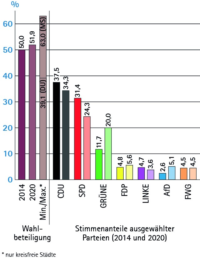 Am 13. September 2020 fanden in Nordrhein-Westfalen Kommunalwahlen statt. Rd. 14,2 Mio. Bürgerinnen und Bürger waren aufgerufen, die parlamentarischen Vertretungen in allen Städten und Gemeinden zu wählen. Zur Wahl standen gleichzeitig die Oberbürgermeister in den kreisfreien Städten, die Landräte in den Landkreisen und die Bürgermeister in den kreisangehörigen Kommunen. Damit gab es nach mehr als sechs Jahren Amtszeit der Räte und Verwaltungsspitzen erneut einen gemeinsamen Wahltermin.
