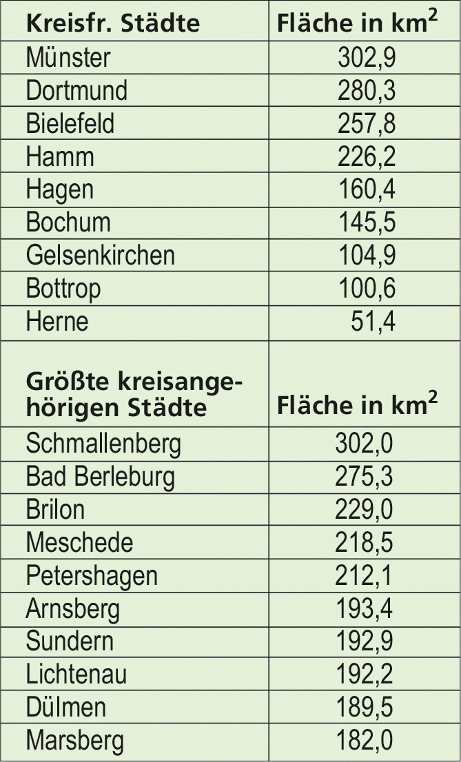 Im Zeitraum von 2001 bis 2015 sank die Landwirtschaftsfläche in Westfalen um insgesamt 4%. Das entspricht einem absoluten Wert von 450 km2 – oder ca. der Katasterfläche der beiden Großstädte Münster und Bochum zusammen (Tab. 1). Anders ausgedrückt: In weniger als zwölf Tagen wurde Westfalen in diesem Zeitraum 1 km2 der landwirtschaftlichen Nutzfläche entzogen. Vornehmlich wurden die Flächen für neue Siedlungsbereiche, Gewerbegebiete, Verkehrswege und Erholungsflächen (s. u.a. Beitrag Rohleder) umgenutzt.