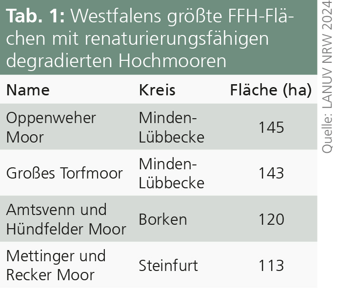 Da die Moorentwicklung normalerweise mit Niedermooren beginnt, ist in Westfalen auch die Hektarzahl der Flächen, auf denen Niedermoore renaturiert werden sollen, deutlich größer als die, auf denen sich wieder Hochmoore entwickeln sollen. In Westfalen gibt es zur Zeit nur noch wenige Hochmoorreste. Wenn sie unter Schutz stehen, etwa als FFH-Flächen, erleichtert das die Renaturierung. Die größten FFH-Flächen mit renaturierungsfähigen degradierten Hochmooren zeigt Tabelle1.