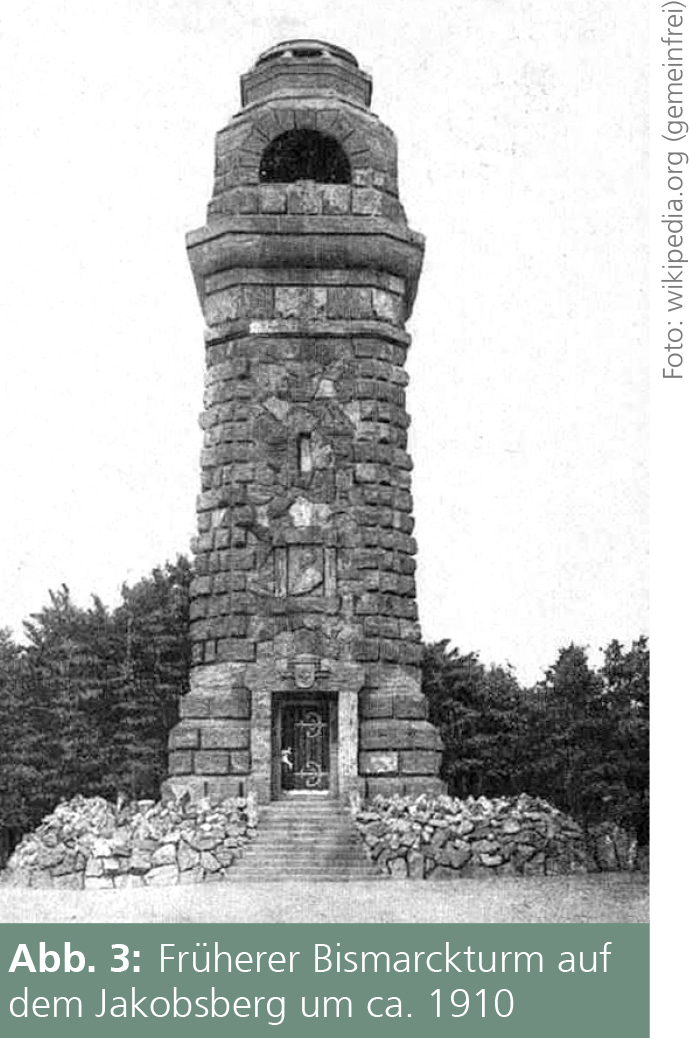 Von 1902 bis 1952 hatte das Abbild des Kaisers einen prominenten Nachbarn: Gegenüber auf dem Jakobsberg wurde zu Beginn des 20. Jh.s eine Säule zu Ehren Otto von Bismarcks errichtet (Abb. 3). Das ebenfalls aus Portasandstein gebaute Denkmal war 22,5 m hoch und verfügte über eine Aussichtsplattform auf 16 m Höhe (Bismarckbund o. J.). 1952 musste der Bismarckturm einem Fernsehturm weichen, nachdem Versuche, den bestehenden Turm diesbezüglich umzubauen, gescheitert waren. Dem Bismarckbund Porta ist es zu verdanken, dass sowohl eine Aussichtsplattform als auch ein Gedenkzimmer an den Reichskanzler Teil des neuen Fernsehturms wurden.