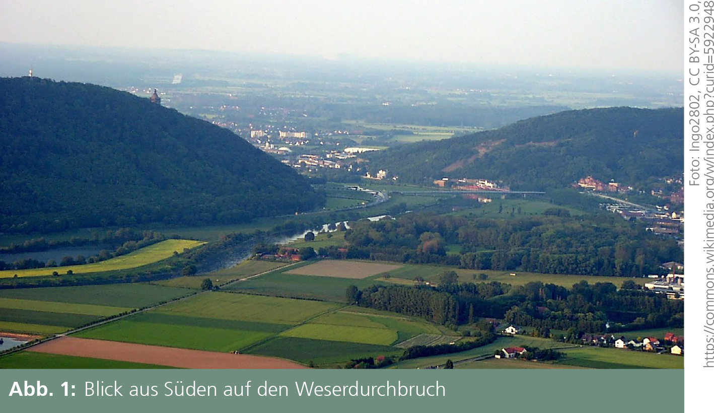 Das Wesertal wurde 2006 an dieser Stelle als Nationaler Geotop klassifiziert. Es ist – neben der Eisenerzgrube Wohlverwahrt im Ortsteil Kleinenbremen (s. Beitrag Grothues) – das zweite dieser Art im Stadtgebiet. Das Tal ist hier 200 m tief und an seiner schmalsten Stelle nur 600 m breit. Neben der Weser samt Auenfläche verlaufen eine Bahnlinie und zwei Bundesstraßen (eine davon als Tunnel). Hinzu kommen der Weser-Radweg und der Europäische Fernwanderweg E 11. Während die Stelle heutzutage eher als Verkehrsengpass gesehen wird, war sie historisch gesehen ein bedeutender Kreuzungspunkt wichtiger Handelswege. Das enge Tal erleichterte darüber hinaus die Verteidigung des unmittelbar nördlich gelegenen Minden. Am rechten, östlichen Ufer befindet sich das Wesergebirge mit dem Jakobsberg, auf dem heute ein Fernsehturm steht. Auf dem zum Wiehengebirge gehörenden Wittekindsberg am linken, westlichen Ufer thront die Kaiser-Wilhelm-Statue (Abb. 1).