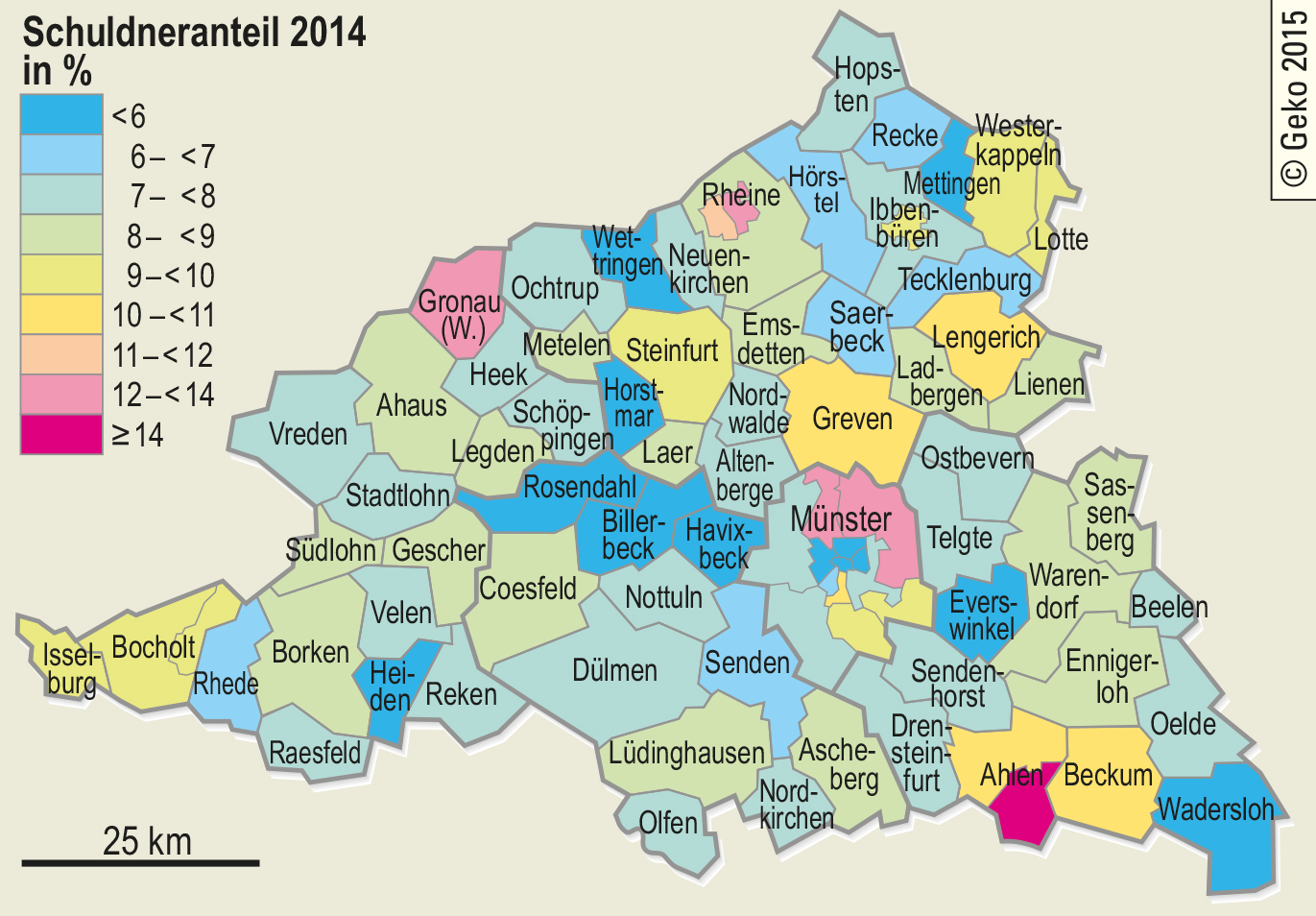 In den Kreisen des Münsterlandes – einschließlich der Stadt Münster – liegen die Schuldnerquoten unter 9% (Abb. 1). Der Kreis Coesfeld nimmt sogar mit 7,4% im Jahr 2014 innerhalb Nordrhein-Westfalens den Spitzenplatz ein. Die das Münsterland prägenden Wirtschafts- und Sozialstrukturen machen sich bei der Schuldnerproblematik durchweg positiv bemerkbar. Die Milieus der sog. Bürgerlichen Mitte, der "Traditionellen" und der "Konservativ-Etablierten" bilden hier eine breite Basis. Zu den wenigen negativen "Ausreißern" gehören dabei der Osten der Stadt Rheine und die Stadt Gronau mit einer Schuldnerquote von jeweils über 13% sowie der Südosten der Stadt Ahlen mit 15,65%. Überall gibt es dort Probleme durch das Vorhandensein sozialer Brennpunkte und durch Schwierigkeiten bei der Reduzierung der Arbeitslosenquoten.