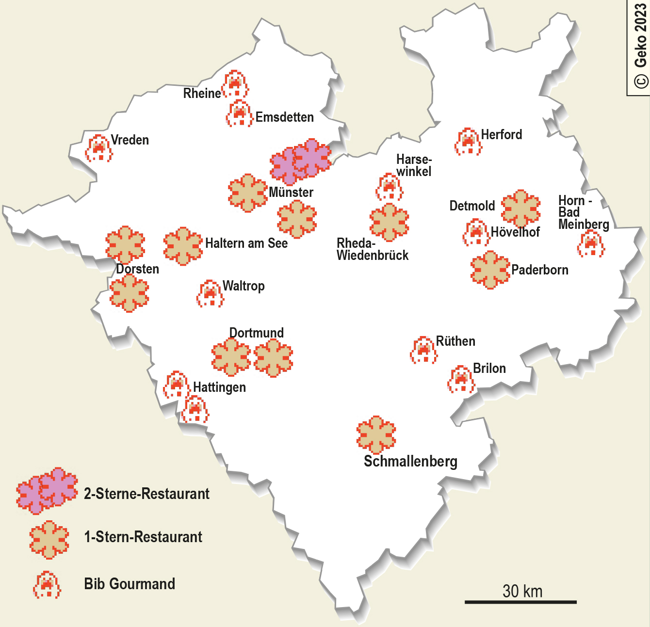 In Westfalen wurden 2023 zwölf Restaurants in die "Sternenklasse" aufgenommen, drei mehr als 2020. Allerdings verlor dabei das bisherige 2-Sterne-Restaurant "Rosin" von TV-Koch Frank Rosin in Dorsten-Wulfen einen Stern. Unweit, in der Dorstener Innenstadt, residiert der ebenfalls bekannte WDR-Koch Björn Freitag mit seinem Restaurant "Goldener Anker" und einem Stern. Ebenfalls mit einem Stern ausgezeichnet sind die Restaurants "Grammons" und "The Stage" in Dortmund, "Balthasar" in Paderborn, "Reuter" in Rheda-Wiedenbrück, die "Ratsstuben" im Ratshotel in Haltern am See, die "Hofstube" im Hotel Deimann in Schmallenberg und "Jan Diekjobst" in Detmold. Führend in Westfalen ist seit 2023 die Stadt Münster: Das "Cœur D‘Artichaut" am Alten Fischmarkt wurde zum alleinigen 2-Sternehaus in Westfalen, jeweils einen Stern bekamen das "Spitzner" und das "BOK Restaurant Brust oder Keule".