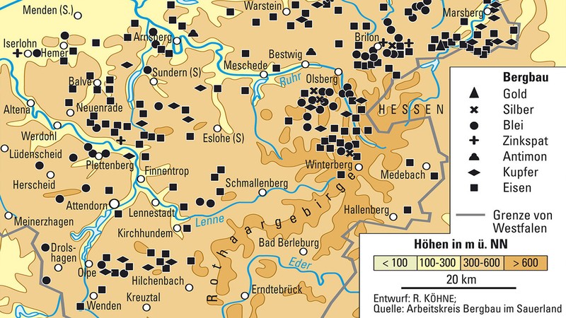 Die naturräumliche Ausstattung des Hochsauerlandkreises mit Bodenschätzen, Buchenwäldern und der Gewässerreichtum boten seit Jahrhunderten die Standortfaktoren für die Gewinnung, Verhüttung und Verarbeitung von Metallen. In den Gesteinsspalten des Gebirgssockels finden sich überwiegend Eisen-, Blei- und Kupfererze. Das bedeutendste Bergwerk lag auf dem Eisenberg bei Olsberg...
