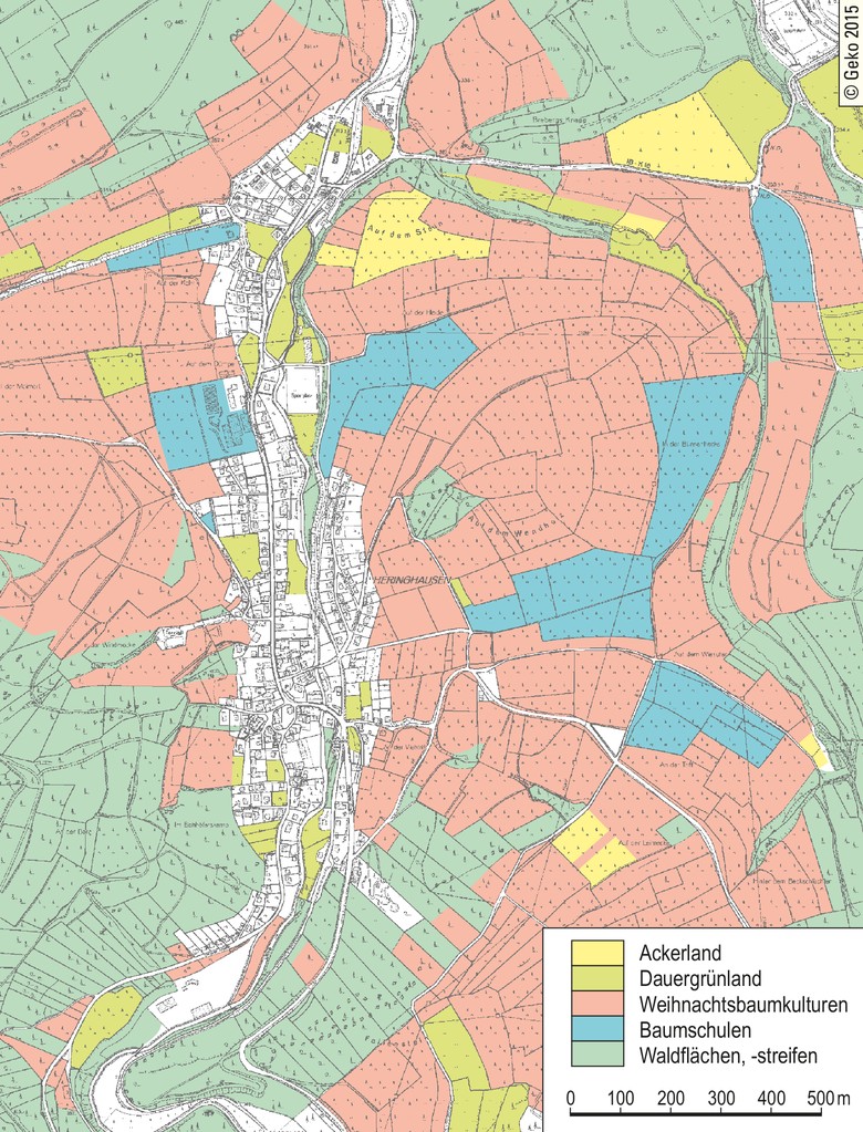 Nach den Waldschäden durch den Sturm Kyrill 2007 (s. Beitrag Schmidt) haben sich in NRW die Anbauflächen von Weihnachtsbäumen im Wald um rund 2.200 ha auf ca. 4.080 ha mehr als verdoppelt. Diese liegen fast vollständig im Sauerland. Die Waldbesitzer haben so gehandelt, weil Weihnachtsbaumkulturen weitaus schneller als die "normale" Forstwirtschaft wieder Einnahmen bringen. Zugleich sind durch diese Forstflächen die Pachtpreise für landwirtschaftliche Flächen nicht weiter gestiegen, denn die "Kyrillflächen" haben eine Entlastung bei der Nachfrage bewirkt. Doch die örtlich z.T. erheblichen zusätzlichen Weihnachtsbaumflächen haben heftige Diskussionen ausgelöst. In Bestwig hat sich die Bürgerinitiative "Giftfreies Sauerland" gebildet, die sich eigentlich nicht gegen den Weihnachtsbaumanbau richtet, aber gegen die ihrer Meinung nach zu intensive und gesundheitsgefährdende Ausbringung von Pflanzenschutzmitteln auf diesen Flächen. Die Landesregierung hat deshalb 2013 das Landesforstgesetz so geändert, dass Weihnachtsbaumkulturen zukünftig nicht mehr im Wald angepflanzt werden dürfen; der Bestandsschutz für bestehende Kulturen im Wald gilt nur bis 2028 (https://recht.nrw.de, Landesforstgesetz). Die Weihnachtsbaumanbauer befürchten, dass der Wegfall der Waldflächen die Existenz zahlreicher Betriebe gefährdet. Immerhin stellen die Weihnachtsbaumbetriebe im Sauerland rund 1.000 Dauerarbeitsplätze und weitere etwa 2.500 Saisonarbeitsplätze.