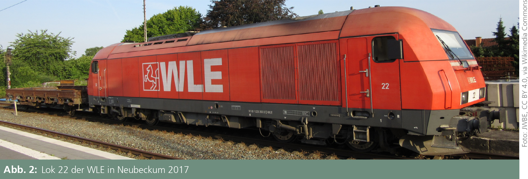 Derzeit umfasst das Logistikunternehmen WLE ein Streckennetz von 120 km Länge (Abb. 1), 10 Diesel- und zwei Elektrolokomotiven, 52 Waggons und 112 Mitarbeitende. Der Umsatz beträgt rd. 15 Mio. Euro pro Jahr – bei rd. 1,2 Mio. t Transportleistung. Organisiert ist die WLE in drei Bereiche: das Eisenbahn-Service-Unternehmen ESU (Werkstatt), die Eisenbahninfrastruktur EIU und das Eisenbahnverkehrsunternehmen EVU.