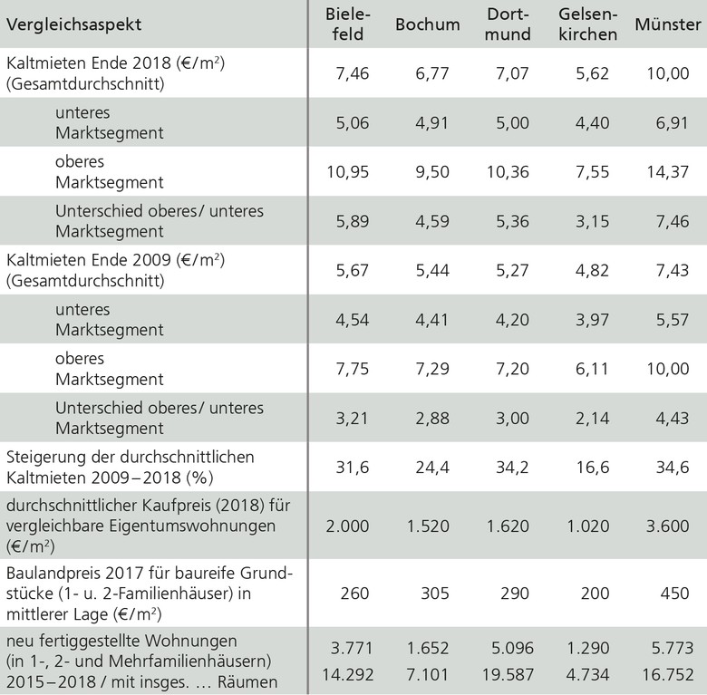 - Bielefeld, Bochum und Dortmund verhalten sich in Bezug auf die Höhe der Kaltmieten relativ ähnlich. Deutlich niedriger ist das durchschnittliche Mietniveau in Gelsenkirchen, deutlich höher in Münster. Auch bei den Kosten für Eigentums-Immobilien gibt es erhebliche Unterschiede.
